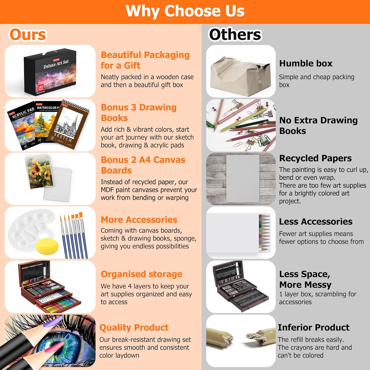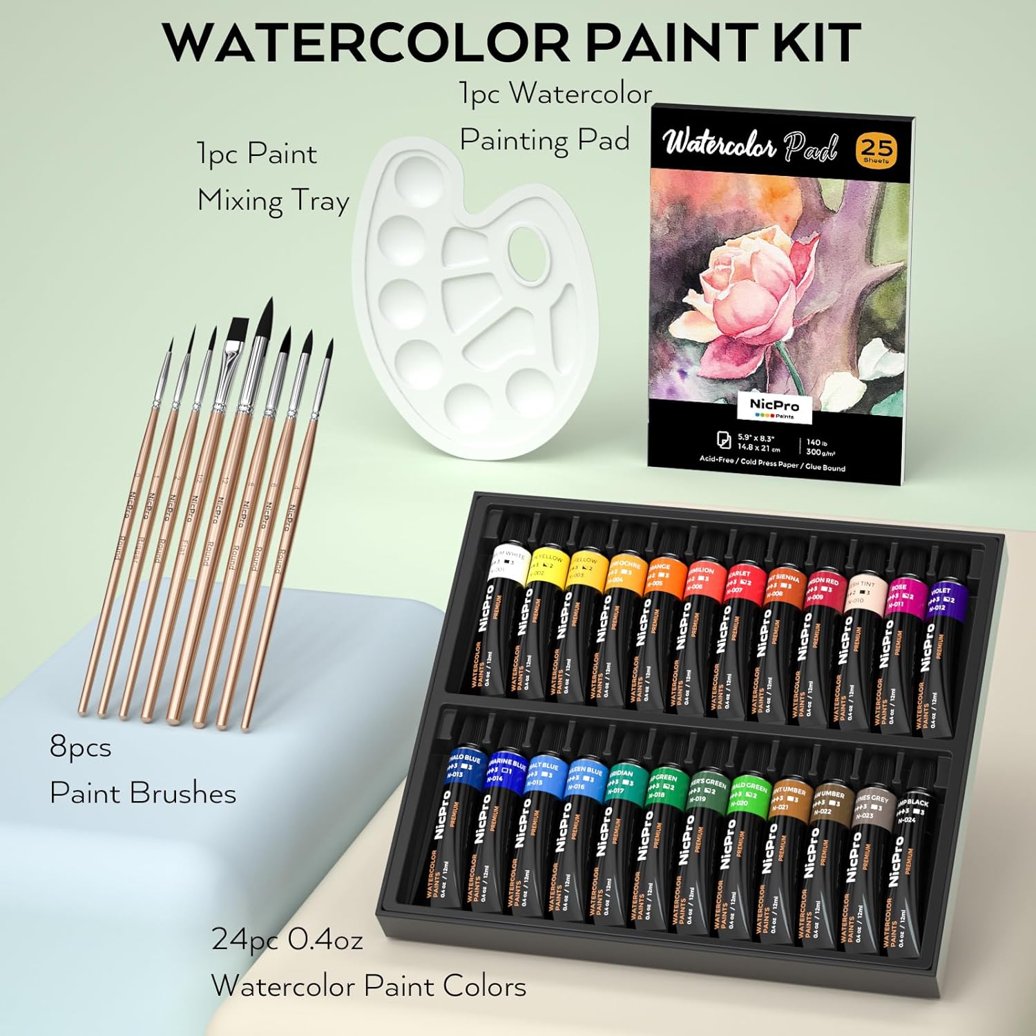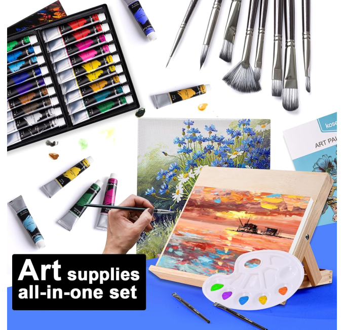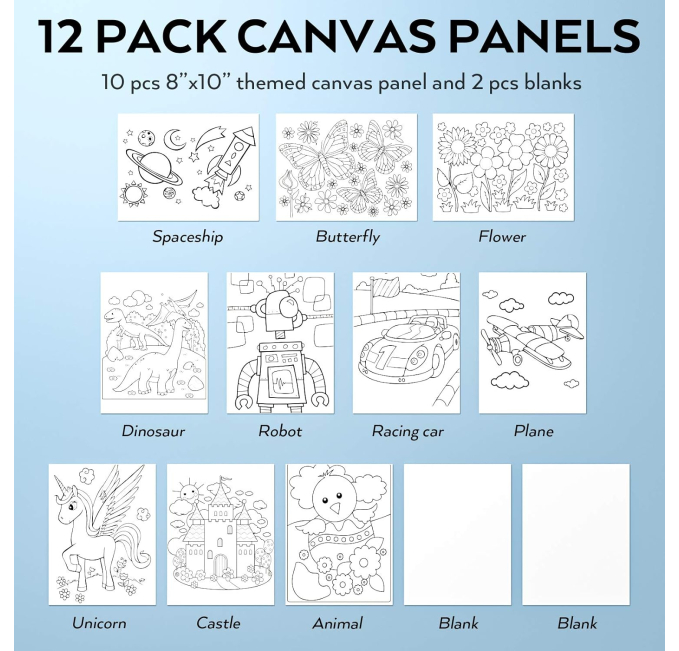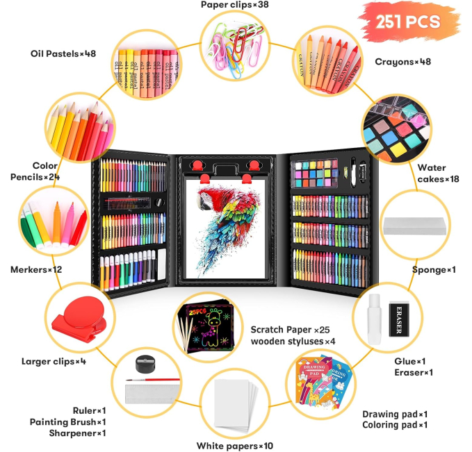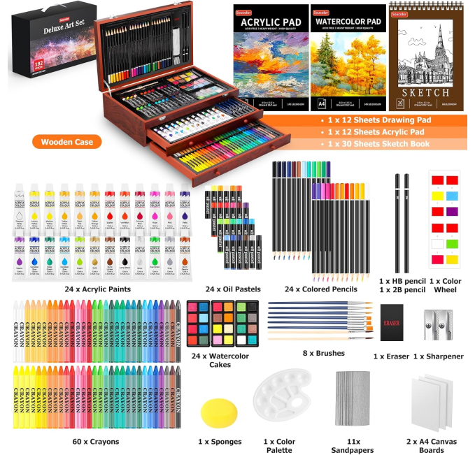 Includes: Acrylic Pad, Watercolor Pad, Sketch Book, Canvases, Acrylic Paint, Crayons, Pencils