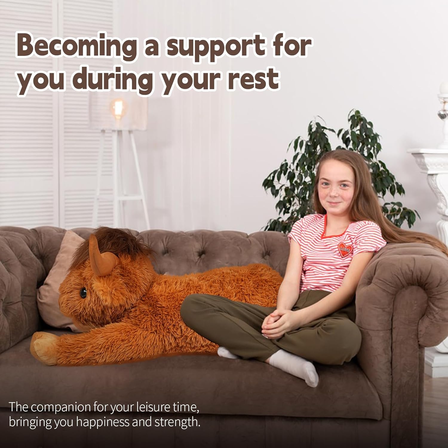 WDXDSOB Highland Cow Stuffed Animal features a large 38.5-inch size and soft plush fabric for ultimate comfort. Perfect as a cuddly gift or decorative pillow for kids and adults. Its realistic dark brown color and detailed design make it a unique addition to any living room or bedroom. Durable and cozy, ideal for hugs and room décor.