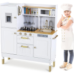 Clevich Play Kitchen is a wooden pretend chef toy set designed for kids aged 3 and up. This kitchen set features realistic lights and sounds, an ice maker, a telephone, and various kitchen accessories. The adjustable height ensures it grows with your child, offering endless fun and imaginative play. Ideal for developing creativity and motor skills, this play kitchen is a perfect gift for boys and girls.