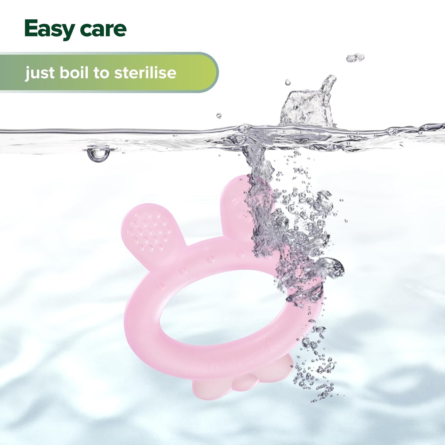 | Care instructions | Before use, clean each teether with a damp cloth and mild soap and air dry. Do not boil, microwave or place in freezer. |